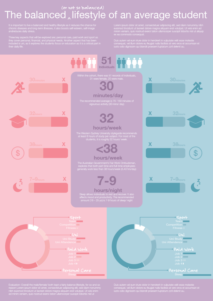 Our Time project will explore what is comprised in having a balanced lifestyle, the comparison of it between the genders of females and males and the comparison between the actual results and recommended averages. The data was recorded over a one-week period, in 30-minute intervals consisting with 51, second year students.